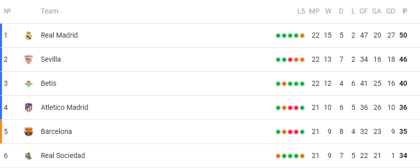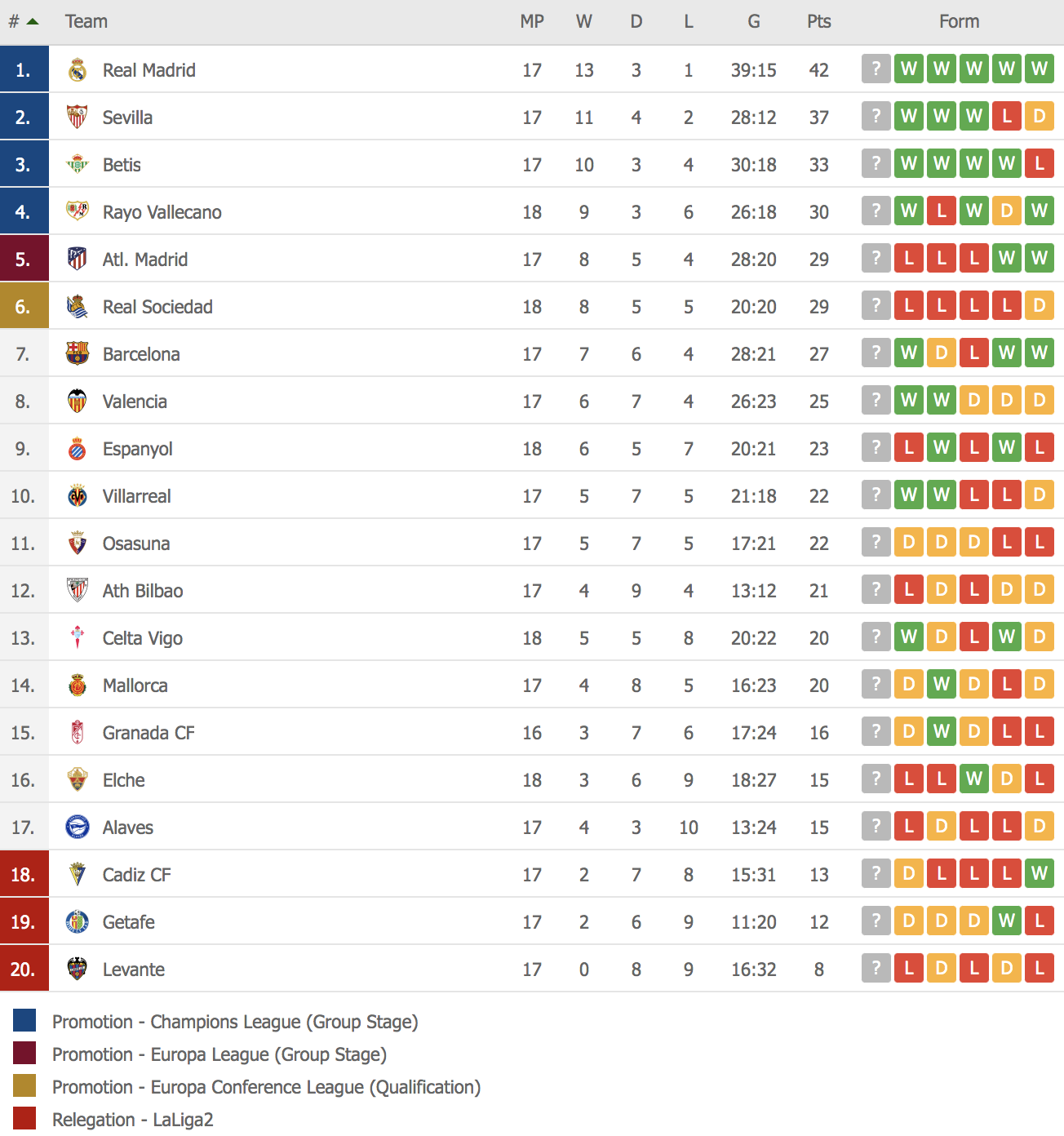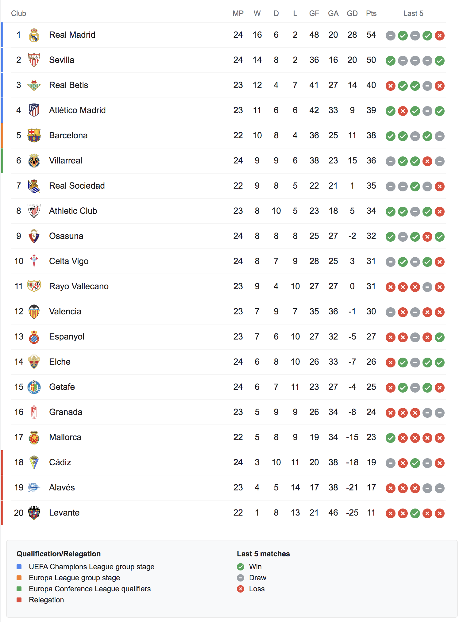 La Liga Table 2021-22 - La Liga Standings & Points Table La Liga Table - Follow the Spanish League Table 2021-22. Also get all the latest updates on La Liga points table & standings, live scores, results, latest news & much more at Sportskeeda.