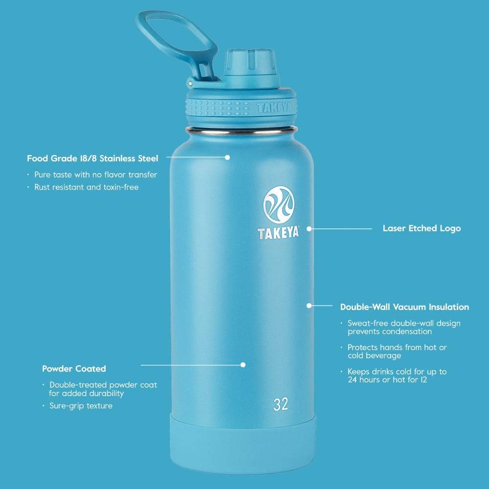 Best Insulated Water Bottles For 2022 Originals insulated water bottle: Takeya originals stainless steel water bottle keeps beverages ice-cold for 24 hrs. Leak-proof spout lid: this insulated stainless steel water bottle comes with an innovative, leak-proof, spout lid that allows for easy one-handed drinking or pouring.